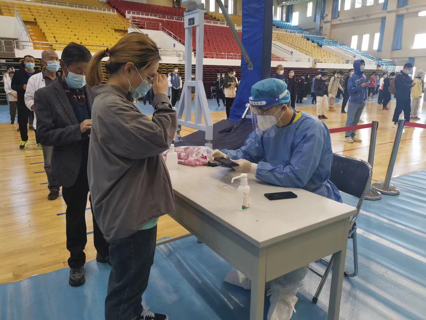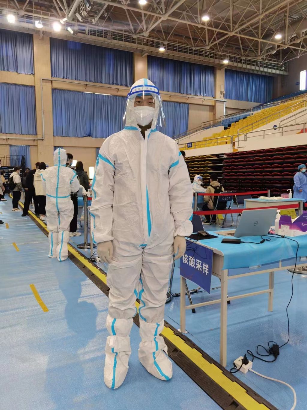 惟其艰难,更显勇毅!4月5日深夜上级紧急通知第二天开展全员核酸检测,然而检测人员严重不足,时间紧任务重。公司分子系系主任高龙成老师了解到实际情况后,主动请缨报名了志愿者,经过现场培训,第二天一早就出现在了检测现场,保障了核酸检测任务的顺利进行,体现出一名教师的使命担当。截至目前,公司已有20余名教职工参加了防疫志愿服务工作。每天在志愿者工作群里,仍有源源不断的教职工主动请缨。征集志愿者的通知一出,即使是在深夜11点,10分钟队伍就能集结完毕,真正的“一岗难求”。他们当中,既有刚刚参加工作的青年教师,也有即将退休的老教授,在抗“疫”一线,他们都是勇毅的战士。刚入职一个月的青年教师李老师穿着厚重防护服、罩着防护面具、戴着N95口罩的“大白”在岗位上一丝不苟地忙碌着,“下一位同学,扫一下身份证,好的,可以啦”。公司工会主席郑咏梅教授在完成核酸信息采集工作后,脱下厚重的防护服,衣服、头发都已湿透,脸上也勒出了深深的口罩痕迹。她说到“只有穿过防护服,才知道那些奋战在疫情防控一线的医护人员多么辛苦,感谢她们的付出。