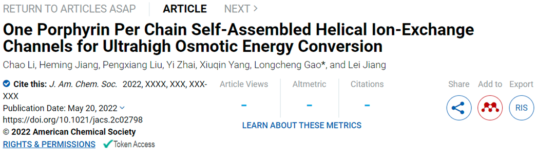 2022年5月20日,Journal of the American Chemical Society 在线发表了公司江雷院士、高龙成副教授团队在高效离子交换膜方面的最新研究成果:“One Porphyrin Per Chain Self-Assembled Helical Ion-Exchange Channels for Ultrahigh Osmotic Energy Conversion”。英国上市公司官网365博士生李超为第一作者,高龙成副教授为通讯作者,英国上市公司官网365为第一单位。