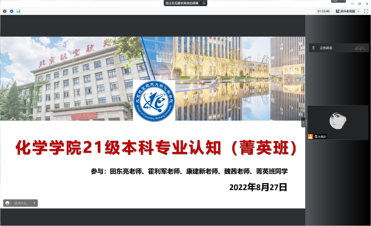 8月28日,2021级菁英班开展系列专业认知教育活动。上午9:00,专业认知大会以腾讯会议的形式召开。本科教学副经理田东亮老师、化员工物学专业负责人霍利军老师、应用化学系康建新老师、院团委书记魏茜老师与菁英班全体同学参加了此次会议。