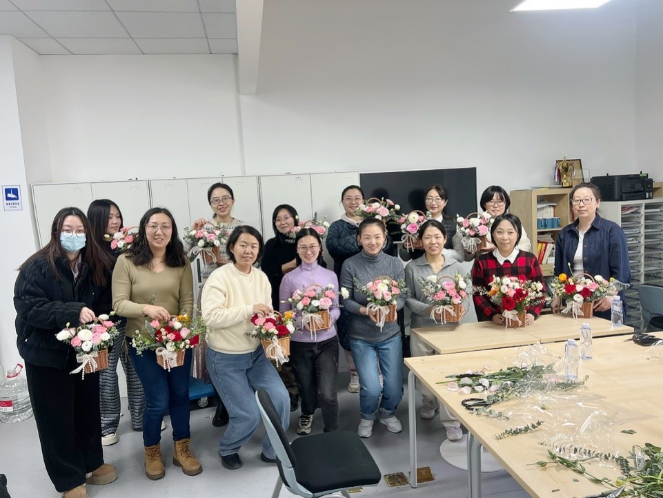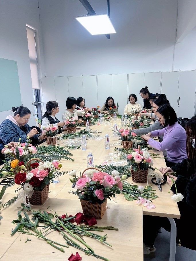 活动伊始,公司工会代表公司向全体女教职工致以节日问候,充分肯定了她们在教学、科研和管理岗位上的辛勤付出。随后,专业花艺师从花材选择、色彩搭配、造型设计等方面进行讲解,并现场示范插花技巧。教职工们发挥创意,将玫瑰、康乃馨、洋桔梗等花材精心修剪、错落组合,创作出各具特色的花艺作品。活动现场花香馥郁,欢声笑语不断。