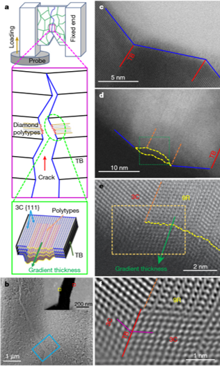 鉴于此,公司郭林教授、岳永海教授团队与燕山大学田永君院士团队通力合作,在充分理解非3C金刚石多型结构基础上采用原位力学实验方法从微纳尺度乃至原子尺度系统研究了具有多级结构的纳米孪晶复合金刚石的增韧机制,提出了金刚石增韧的新思路,解决了金刚石材料无法兼具高硬、高韧的科学难题!